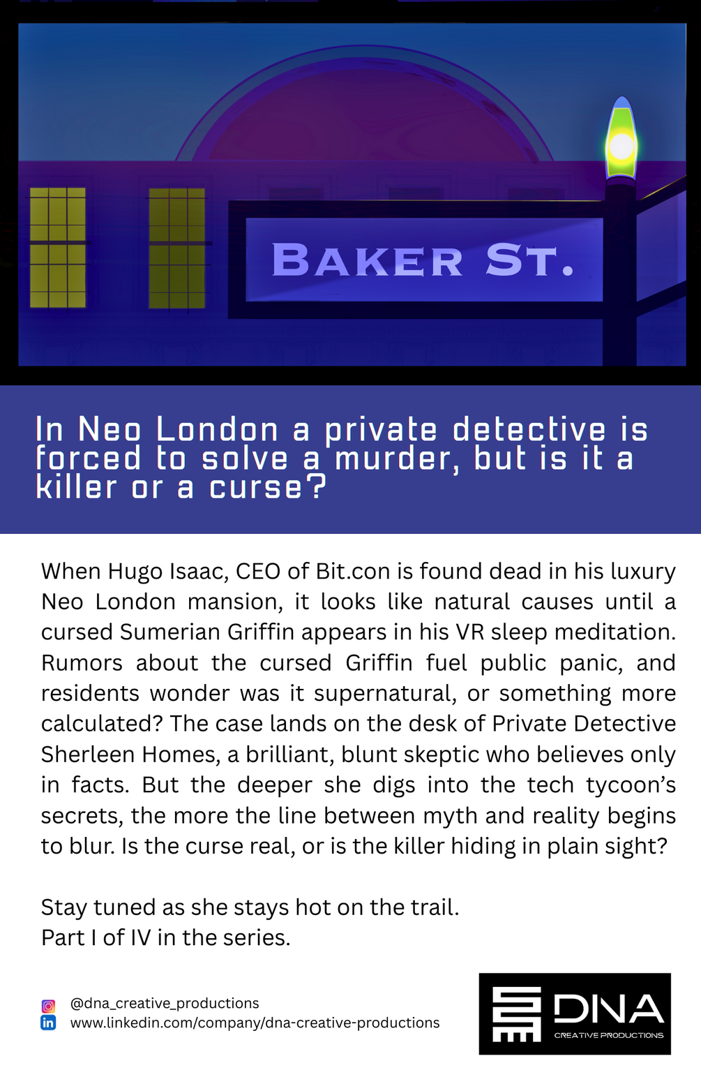 When Hugo Isaac, CEO of Bit.con is found dead in his luxury Neo London mansion, it looks like natural causes until a cursed Sumerian Griffin appears in his VR sleep meditation. Rumors about the cursed Griffin fuel public panic, and residents wonder was it supernatural or something more calculated? The case lands on the desk of Private Detective Sherleen Homes, a brilliant, blunt skeptic who believes only in facts. But the deeper she digs into the tech tycoon’s secrets, the more the line between myth and reality begins to blur. Is the curse real, or is the killer hiding in plain sight?